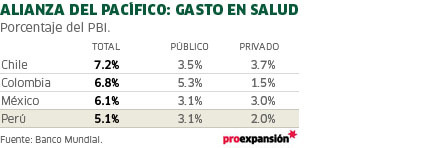 En el siguiente cuadro elaborado por Proexpansión con cifras del Banco Mundial se muestra el gasto en salud que hacen los países miembros de la Alianza del Pacífico. Mientras que el gasto público es aquel ejecutado por el gobierno central y local, el gasto privado es aquel que emana de las familias a través de pagos por atención directa y seguros privados. Perú es el país que menos gasta en total en salud con sólo un 5.1%. El gasto público es el menor junto con México con un 3.1%. Finalmente, Colombia es el país del grupo cuyo aporte privado es el menor con un 2%