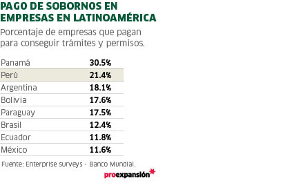 Un último estudio del Banco Mundial da cuenta de este tema. Enterprise Surveys 2014 es una encuesta a nivel de empresas realizada en 135 países, donde se indaga sobre diferentes temas en ellas como medio ambiente, financiación, corrupción, delincuencia, entre otros. En Latinoamérica el 11,3% de empresas consideran que haciendo pagos informales o dando regalos a los funcionarios públicos se pueden conseguir trámites y permisos. Perú es el segundo país de la región donde más empresas creen que esto es así.