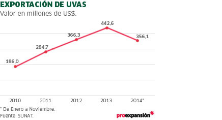 Las uvas son uno de los principales productos agrícolas de mayor exportación del Perú. De Enero a Noviembre de este año se han exportado poco más de 356 millones de dólares. En los últimos 5 años, las exportaciones aumentaron en 164%.