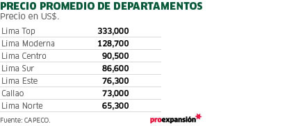 Los precios de venta de departamentos mantienen la tendencia de años pasados, siendo Lima Top (sector compuesto por los distritos de Miraflores, San Isidro, La Molina, Santiago de Surco, San Borja) la de mayor precio promedio. En el siguiente cuadro, elaborado por Proexpansión, con información del XIX Estudio “El Mercado de Edificaciones Urbanas en Lima Metropolitana y el Callao” desarrollado por el Instituto de la Construcción y el Desarrollo (ICD) de CAPECO, se muestran los rangos de precios promedios de oferta de departamentos según la zona de Lima. El precio promedio de un departmento en Lima es de US$142 964.