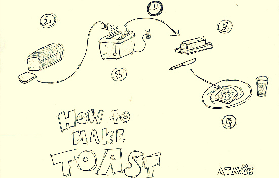 Para el diseñador Tom Wujec no hay mejor forma que afrontar un problema o reto que dibujando todo su proceso, paso a paso. Es por ello que durante años ha pedido a las personas dibujar cómo hacer tostadas, una actividad que aunque sencilla, se vuelve confusa al momento de tener que dibujarla por pasos.