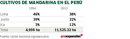 Junto con la naranja y el limón ácido la mandarina es el cítrico más producido en el Perú. Son 11,5 mil las hectáreas destinadas a su producción, lo cual significa un crecimiento de más del doble en el área de cultivo desde 1994. Las tres principales regiones productoras de mandarina son Lima, Junín e Ica, siendo esta última la que más ha crecido desde 1994: su área de cultivo es 10 veces más de lo que era en 1994.