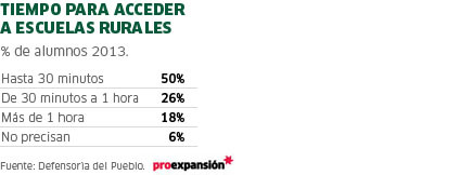 En el siguiente cuadro elaborado por Proexpansión con cifras de la Defensoría del Pueblo se muestra el tiempo que tardan los niños de áreas rurales para llegar a sus escuelas. Los tiempos presentados adquieren otra connotación si se tiene en cuenta que el 84% de los estudiantes de escuelas rurales acuden a pie a sus centros de estudio.