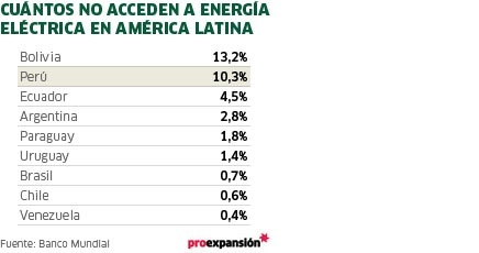 La mayor parte de estas poblaciones que no acceden a energía eléctrica se encuentran en América Latina, África y Asia. En América Latina, Bolivia es el país con menor acceso a electricidad, dónde el 13,2% de su población aún no cuenta con luz y calefacción en sus hogares. Perú le sigue muy de cerca en un poco honorable segundo lugar con el 10,3% de su población, es decir más de 3 millones de peruanos sin electricidad.
