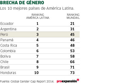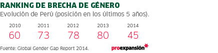 Llama la atención la ubicación actual de Perú (puesto 45), dado que tan sólo el año pasado se ubicaba en el puesto 80, lo que significa un gran avance en la lucha por acortar la brecha de género en el país. Esta ubicación lo regresa a la posición en la cual se ubicaba para el año 2009, luego de varios años de no tener una buena posición en el ranking mundial. A nivel regiona,l se ha superado a Brasil (71), Chile (66) y Uruguay (82)
