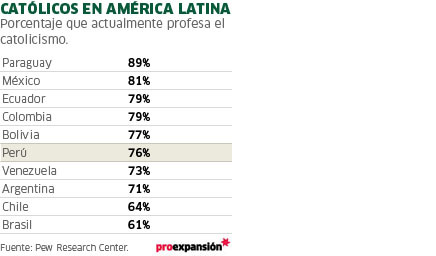 El país con mayor porcentaje de católicos es Paraguay donde el 89% se reconoce como católico. En contraste, el país con menos católicos es Uruguay donde el 42% confesa esa religión. Perú se encuentra por encima del promedio regional con 76% de peruanos católicos.