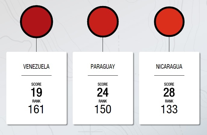 En América Latina, Venezuela es el país más corrupto con una puntuación de 19. El país más transparente es Uruguay con una puntuación de 73. Perú se encuentra a la mitad de la tabla en el puesto 8 de 20 países de la región con una puntuación de 38, similar a los últimos 3 años.